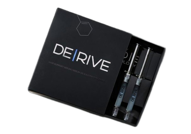 DE|RIVE is a non-surgical hair restoration treatment that uses a natural, plant-based serum to improve scalp health and stimulate hair growth. The serum contains concentrated growth factors (exosomes) that target hair follicles, and treatments combine in-office sessions with a daily take-home serum for best results.